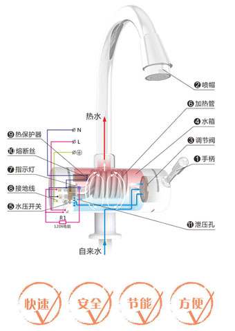 “飞羽”牌即热式水龙头引进的是同行业中最先进的德国莱诺电气技术,采用的是24小时自动热感温紫铜加热管,高达98%的电热转换效率,出水即热,节能30%,它的功率是3000w,水温30℃-60℃可调(实际水温和出水量会因各客户家中入户水压不同略有偏差)。