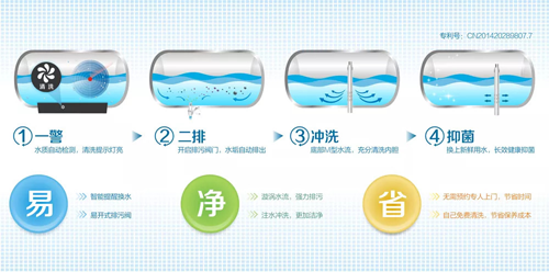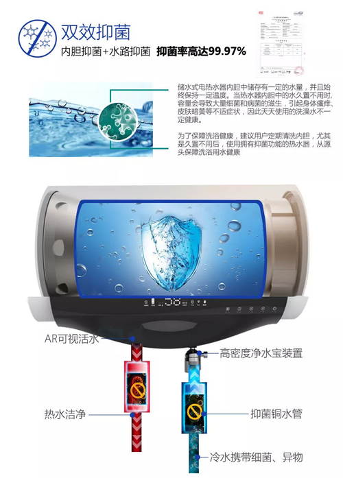 360°离子净水净化水质,内胆自助清洗轻松排污,双效抑菌抑制细菌滋生,让家人洗个健康好澡。