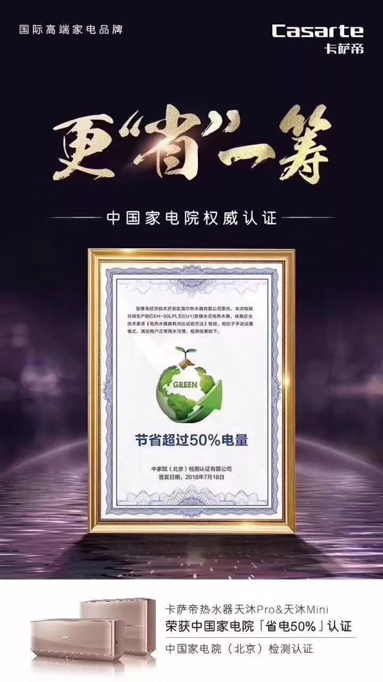 不久前,卡萨帝电热水器-天沐PRO和卡萨帝电热水器-天沐MINI获得了中国家电院检验颁发的“节电50%以上”的权威认证。节电一直是电热水器消费者最关心的体验之一,但是哪种电热水器节电更多,效果如何?普通人一般很难判断,这份权威的认证报告使节电效果显而易见。