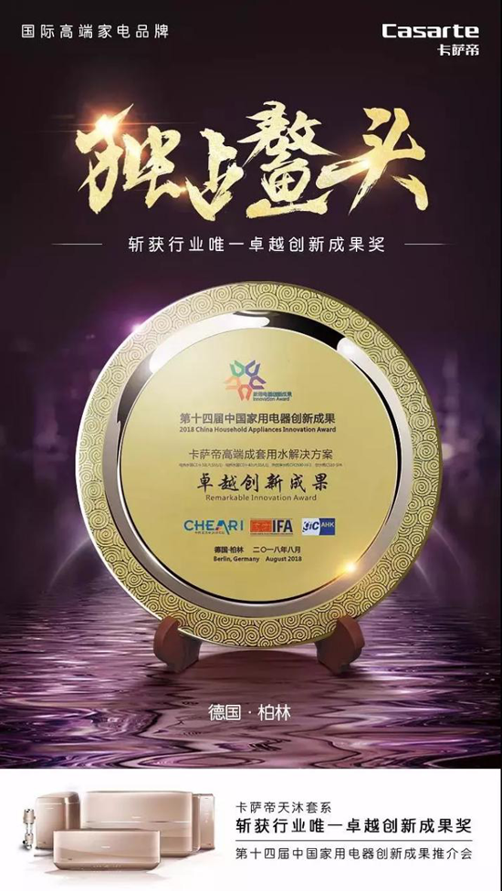 在此前中国家用电器研究院主办的“第十四届中国家用电器创新成果推介”IFA展上,卡萨帝热水器天沐套系还获得年度卓越创新成果大奖肯定,也变为了行业唯一获此殊荣的套系产品。