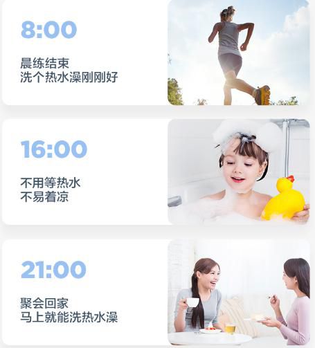 通过手机APP可实现24小时单独预约,可实现远程开/关机、智能预约、调节温度等功能,让热水出现的更加及时,随时随地畅享舒适沐浴。