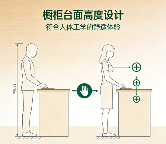 烹饪区:考虑到灶具高度和烹饪安全,通常比标准高度低5-8厘米(75-80厘米)。这个高度能让使用者自然注视锅内食物,同时避免热气直面扑来。