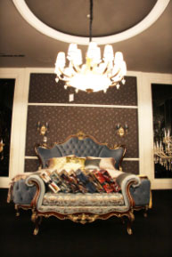 大唐照明展厅的一款欧式吊灯,下面配备了欧式床,场景逼真,光影协调