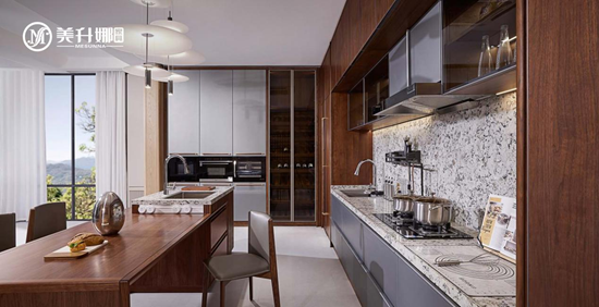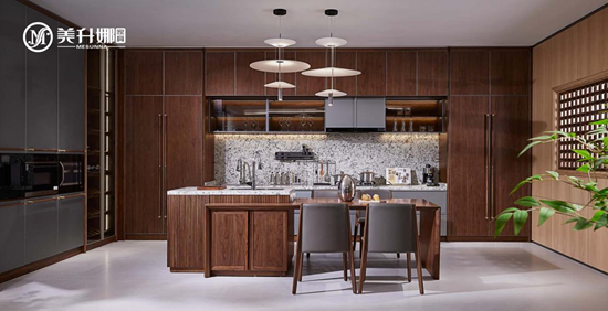 在家的所有空间中,厨房是最能体现生活温度的地方。这里既有柴米油盐的琐碎,也有亲友相聚的热闹;既有油烟的喧嚣,也有木质的沉静。美升娜家具以北美黑胡桃木为材,在厨房空间里编织实用与美学的双重奏,让蒸腾的烟火气与温润的木之韵在此共生共舞,将日常烹煮化作一场具象的生活艺术。