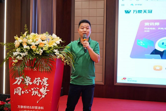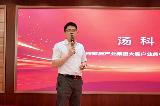 旺德府家居集团大客户业务中心总经理汤科先生,围绕政策与产品赋能体系进行详细解读。在阐述品牌及核心产品竞争优势的同时,重点强调板材+辅材的产品推广布局,明确以此助力品牌与合作伙伴共同开拓高端家居市场。