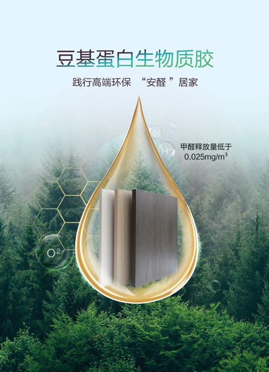 告别传统含醛胶黏剂,创新采用豆基蛋白生物质胶,以植物蛋白的天然稳定黏性,让板材饰面无惧温差与岁月侵蚀,长久使用依旧平整顺滑,不开裂、不起翘;再搭配高密度优质基材,更赋予板材卓越的防潮耐刮性能,轻松应对厨房的潮湿水汽、客厅的日常磕碰磨损。
