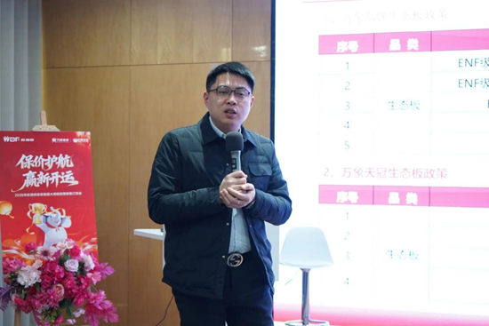 随后,旺德府家居集团供应链中心总经理周军先生围绕2026年度供应体系、产品研发及环保创新发表专题讲话,重点强调将持续提升产品性能与环保标准,加快产品拓展与结构优化,以更稳定的品质与更高效的交付能力,为市场与合作伙伴提供有力支撑。
