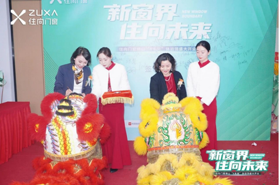 剪彩仪式后,醒狮点睛环节将现场气氛推向高潮。廖敏女士和杨砚涵女士手持金笔,为祥狮点睛,寓意着住向门窗在新的一年里生意兴隆,财源广进。醒狮舞动,锣鼓喧天,现场观众无不为之振奋,共同感受传统文化与现代科技的完美结合。醒狮的威武与门窗的精致相得益彰,展现出住向门窗在传承与创新中的独特魅力,也象征着品牌将在新的一年里如醒狮般活力四射,勇往直前。