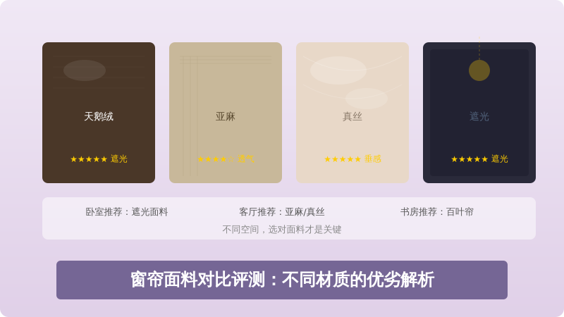 总的来说,卧室推荐遮光面料或天鹅绒,客厅推荐亚麻或棉麻混纺,书房推荐百叶帘或半遮光面料。选购时建议先明确使用空间和功能需求,再根据预算选择合适的面料材质。