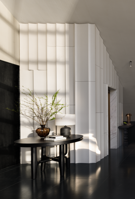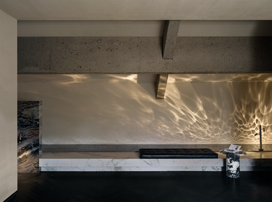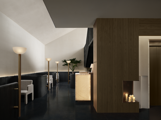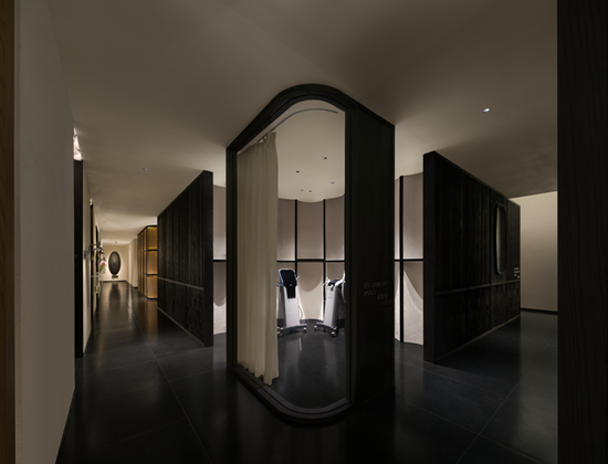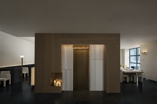 踏入室内,光线主导材质对话。透光玉石与原木岛台交织光影,奠定纯粹质感;白金沙石台阶与黑色木材在光线映衬下冷暖相映。无主灯设计以间接照明与氛围光源构建光系:陶砖电梯间内,壁龛烛火散发暖调微光;前台借背景与透光桌面,让光线在墙面静静流动。木阶与墙面的明暗对比自然划分等候、交流区,光线成为空间的隐形引导。