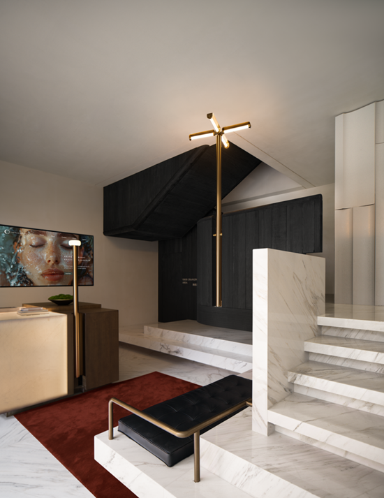 The second-floor beauty center prioritizes the “experience.”Consultation Area: Dark wood paneling envelops this private space, while soft, diffused light is evenly distributed to ensure comfort and focus during consultations.Formulation Room: Fully transparent glass partitions paired with even, soft lighting allow professional equipment to be clearly visible, creating a clean and sophisticated ambiance.Wash and Shampoo Area: A Venetian brown marble vanity paired with an artistic pendant light, with warm lighting highlighting the gilded patterns;The shampoo area features a woven wood partition, where the rattan texture creates a soft, dreamy ambiance under the interplay of light and shadow. Low-level soft lighting, combined with the sounds of flowing water and massage, sets the stage for relaxation.
