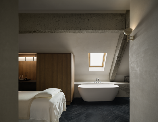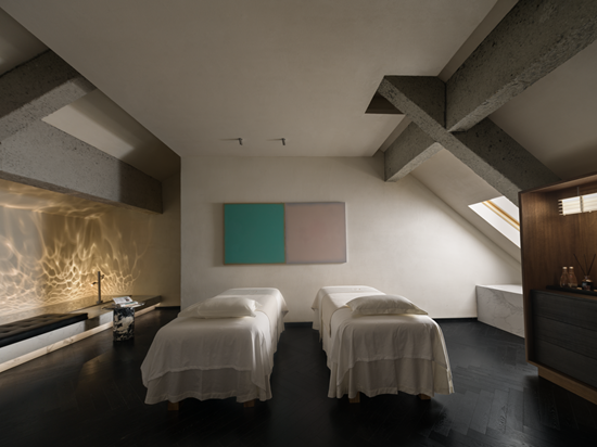 The third-floor wellness area features private treatment rooms designed to precisely meet a variety of therapeutic needs. The single rooms utilize diffused natural light from skylights and soft pastel-toned artwork to create a serene space for solitude; the family rooms combine playful elements with soft, warm lighting; and in the double rooms, rippled stainless steel, marble, and leather benches reflect subtle textures in the light.
