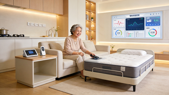 - 非接触式心率/呼吸率监测仪(智能床垫型) :获得二类医疗器械认证的床垫型监测仪,可自动监测老年人睡眠情况及心率变化,铺于床单之下即实现无感监测,还能生成心率间期散点图,反映自主神经对心脏的调节能力。2026年春节年货节期间,搭载心率、睡眠监测及异常预警功能的适老智能床垫成为电商平台热门品类。