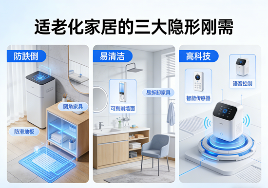 防跌倒,给了他们行走的安全感;易清洁,给了他们掌控环境的尊严感;高科技,给了他们连接世界与被守护的归属感。这三大隐形刚需,互为支撑,缺一不可。